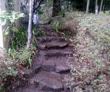 作業前、イノシシに掘り起こされ石階段が崩されています。凄い力です。