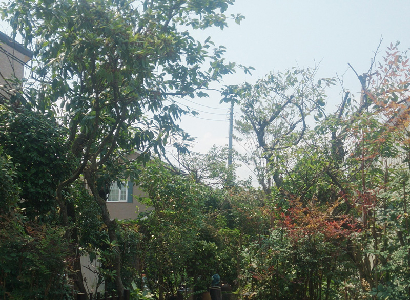 作業前、ウメ・カキ・サクラ・ユズリハ等かなり伸びています。 お客様の御要望は「高さをかなり下げたい」との事でした。