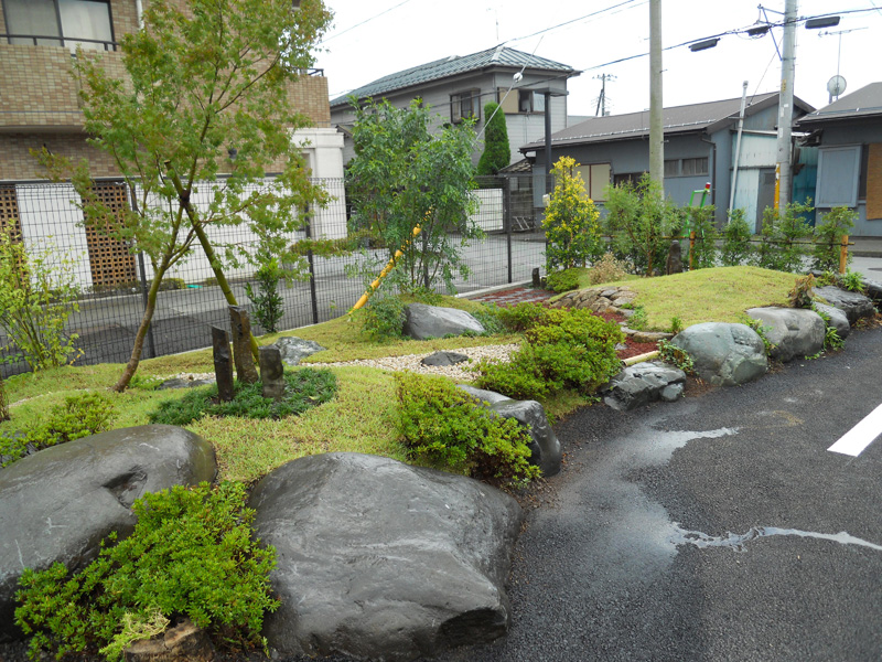 築山を創り、立体感を出しました。イロハモミジ・シマトネリコ・サニーフォスター(西洋ヒイラギ)