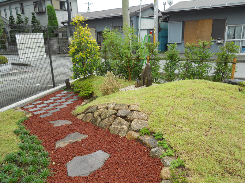 赤スコリアの化粧砂利とアクセントに溶岩プレートを市松模様に
